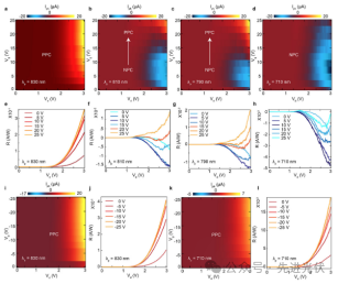 图2通过一系列二维等高线图,详尽刻画了光电响应如何受波长(λp)、栅压(Vg)和漏源电压(Vd)这三个关键参数的控制。a-d 图:分别对应830 nm, 810 nm, 790 nm 和710 nm波长下,光电流随Vd和Vg变化的二维分布。颜色从暖色(正,PPC)到冷色(负,NPC)的渐变,清晰展示了随着激发光子能量的增加(波长从830 nm减小到710 nm),器件的主导响应从PPC区域向NPC区域演变的过程。特别是在790 nm和810 nm时,图中同时存在PPC和NPC区域,表明这是一个由Vg和Vd控制的过渡区间。e-h 图进一步给出了对应波长下的响应率曲线,量化了光电转换效率。i-l 图:补充说明了在负栅压条件下,器件在不同波长下均表现为PPC,这与正栅压下的复杂行为形成鲜明对比,强调了栅极极性在调控载流子类型和浓度方面的重要性,为后续的机理解释提供了实验证据。