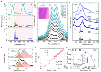 图3 低温光学特性揭示激子与陷阱态。a图4K低温PL光谱是揭示微观机理的关键。清晰地显示在MoSe₂区域,存在明确的激子(X⁰)和三粒子(X⁻)发射峰,峰位间隔约23 meV,这直接证明了三粒子的存在。在WSe₂区域,则观察到强烈的、尖锐的缺陷态或陷阱态相关发射。这些本征的光学特性为解释器件行为提供了物质基础:MoSe₂是n型,易于提供电子形成三粒子;WSe₂是p型,且富含陷阱态。b-d图通过功率依赖的PL光谱表明,在MoSe₂中,三粒子的峰强随激发功率增加而增强,证明其三粒子形成能力。e-f图展示了WSe₂区域PL随温度的变化,其发射峰的红移行为有助于理解陷阱态能级分布。