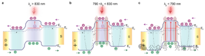 图4用简洁的能带示意图分三种情况解释了不同激发波长下的物理过程:a) λp > 830 nm(低能量激发):光子能量不足以激发本征激子,但可以激发WSe₂中低于导带的陷阱态载流子,使其跃迁到导带参与导电,导致PPC。b) 790 nm < λp < 830 nm(过渡区):光子能量足以产生激子,同时陷阱态也被激发。此时,陷阱态载流子贡献的PPC和激子扩散后可能形成三粒子所贡献的NPC相互竞争,导致光电响应可调。c) λp < 790 nm(高能量激发):在WSe₂中产生大量激子,这些激子扩散到界面,被n型MoSe₂中的自由电子捕获,形成三粒子。三粒子有效质量大、迁移率低,减少了自由载流子浓度,从而导致NPC。
