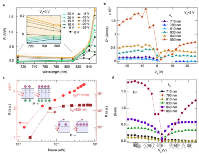 图5对器件的实际应用性能进行了评估。a图清晰地对比了在正负栅压下,响应率随波长的变化关系,再次强调了栅极极性对响应符号的调控作用。b图计算了器件的比探测率(D*),最高值达到1.92 × 10¹⁰ Jones,证明了其良好的光电探测能力。c图的功率依赖关系显示,710 nm激发下光电流随功率线性增长,符合激子/三粒子生成机制;而830 nm激发下出现饱和,符合陷阱态填充饱和的机制。d图展示了光增益与栅压的关系。
