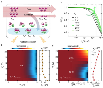 图6通过微观理论模型为实验现象提供了坚实的理论支撑。a图概括了理论模型的出发点:光激发导致三粒子形成,减少自由载流子,降低电流。b图基于Saha方程的理论计算表明,自由载流子比例随总载流子密度和栅压(掺杂浓度)变化,预测了三粒子形成的条件。c图的理论模拟结果(710 nm激发)与实验观测高度一致,成功复现了NPC现象及其饱和行为。d图的理论模拟(考虑30%的去陷阱化效应)同样复现了在高于共振激发波长下的NPC-to-PPC转变,与实验数据(图2c)吻合,证明了理论模型的普适性和准确性。