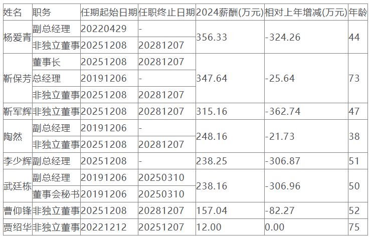 从薪酬看,董事和高级管理人员合计领取报酬1912.74万元,平均薪酬240.46万元,年薪中位数为248.16万元。其中,副总经理及非独立董事杨爱青薪酬最高为356.33万元,非独立董事贾绍华薪酬最低为12.00万元(2024年任期不满1年的不参与统计)。
