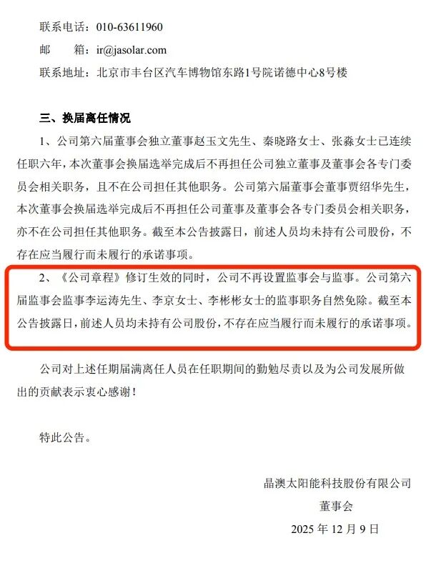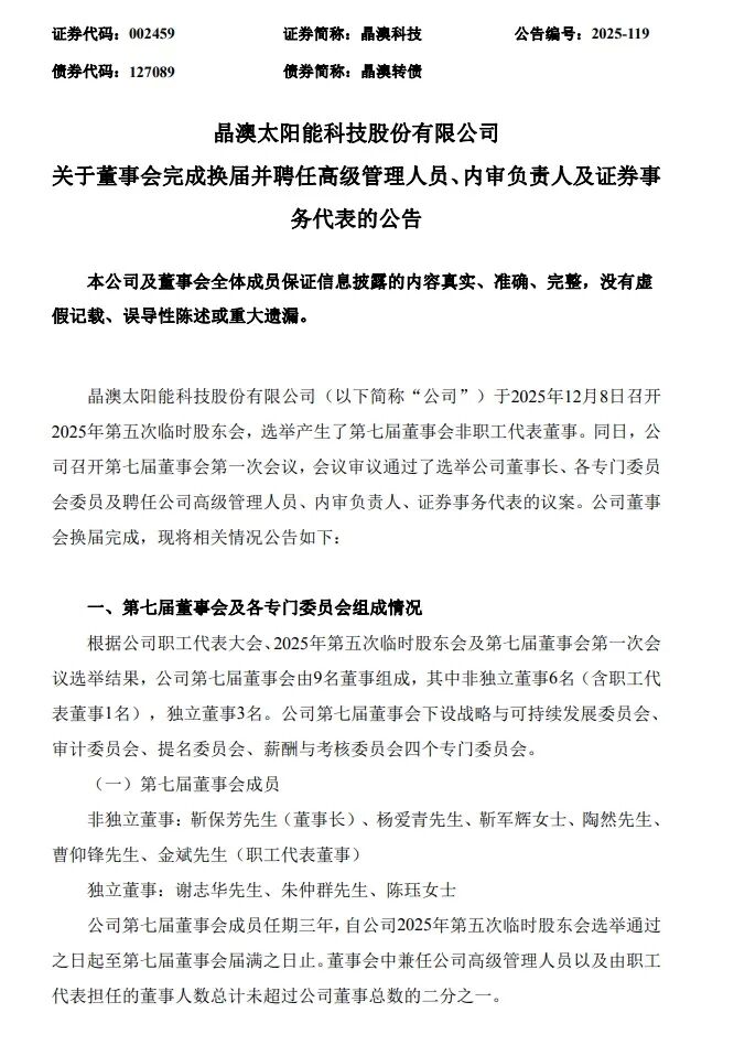 晶澳科技于2025年12月8日召开2025年第五次临时股东会,选举产生了第七届董事会非职工代表董事。