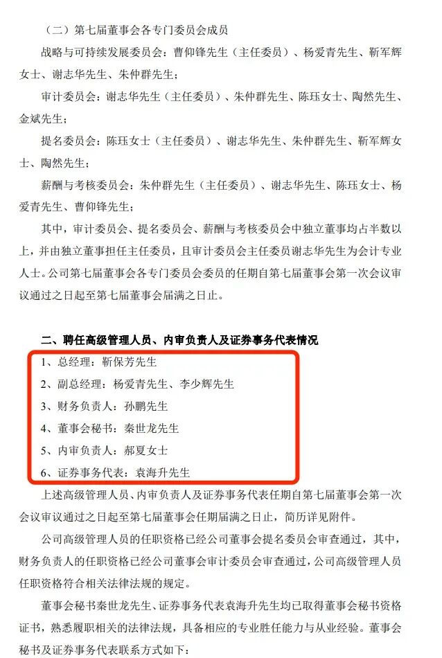 公司聘任靳保芳先生为总经理,杨爱青先生、李少辉先生为副总经理,孙鹏先生为财务负责人,秦世龙先生为董事会秘书,郝夏女士为内审负责人,袁海升先生为证券事务代表。