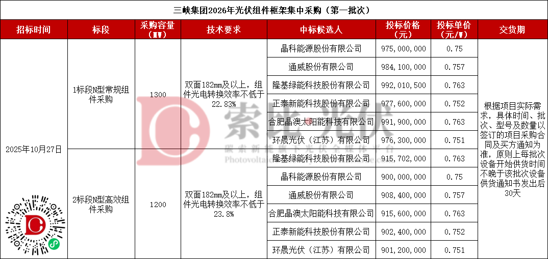 12月11日,三峡集团2026年光伏组件框架集中采购(第一批次)中标候选人公示,预估采购总容量2500MWp。本项目共设2个标段,其中: