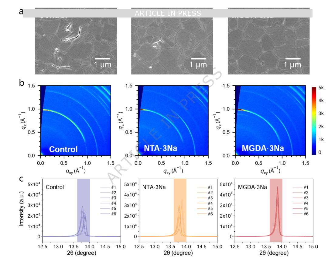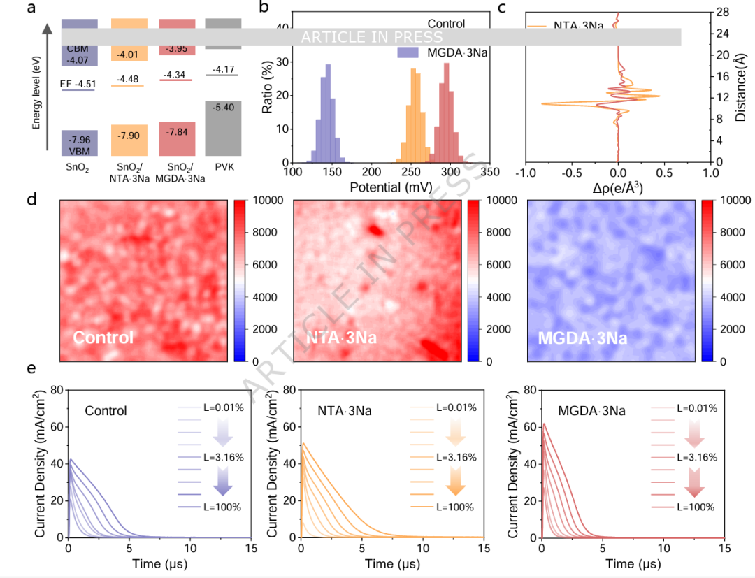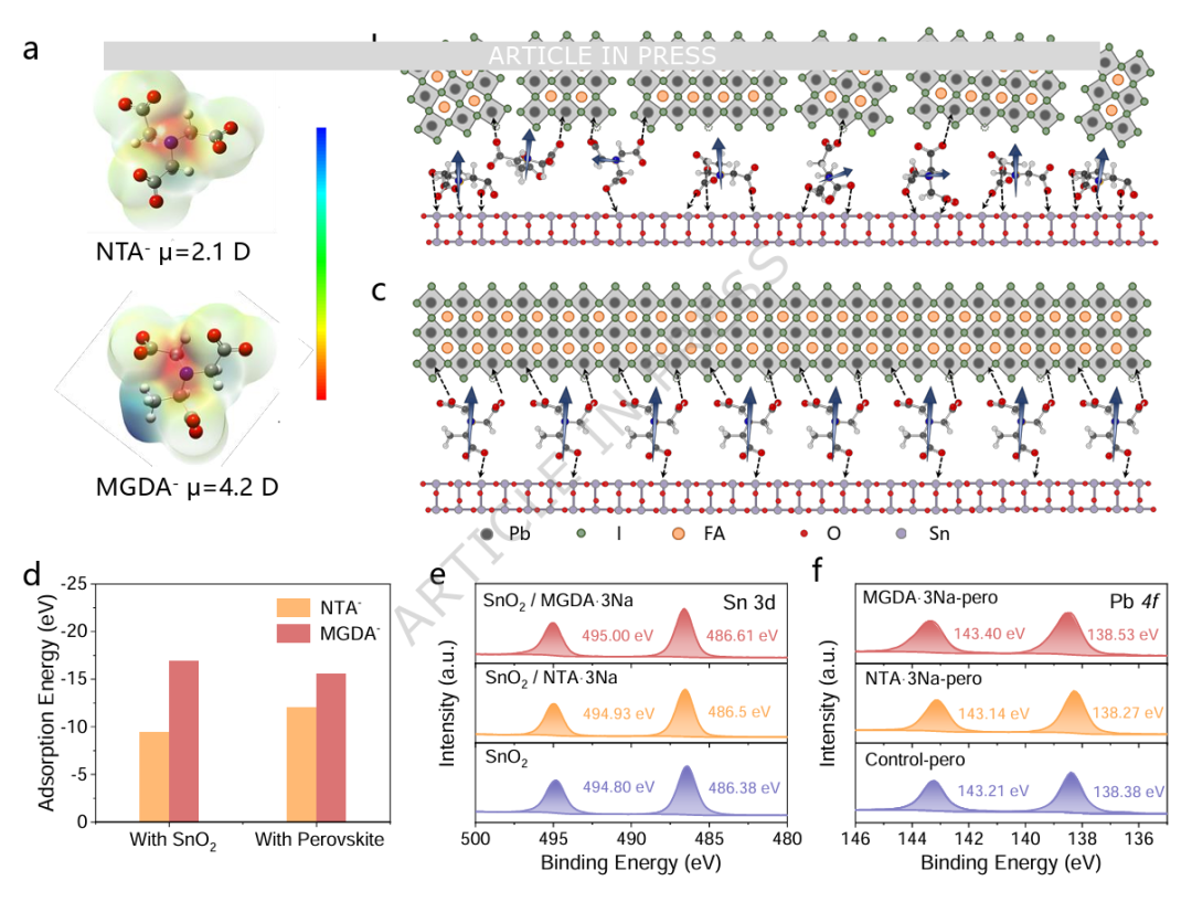 - 创新型分子设计:开发了一种双功能不对称分子MGDA-3Na,通过其甲基侧链实现分子内极化与偶极重排,能够在SnO₂和钙钛矿界面实现垂直双向锚定,解决了传统界面分子随机分布导致的钝化不均和无效偶极问题。