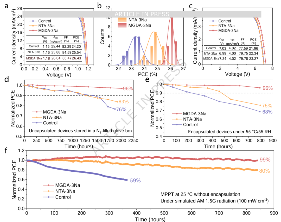 - 卓越的稳定性:器件表现出优异的长期运行稳定性。在氮气手套箱中2000小时、55°C/55% RH湿热条件下800小时以及最大功率点连续光照800小时后,效率保持率分别高达96%、96%和99%,远超对照组,为商业化应用奠定了坚实基础。