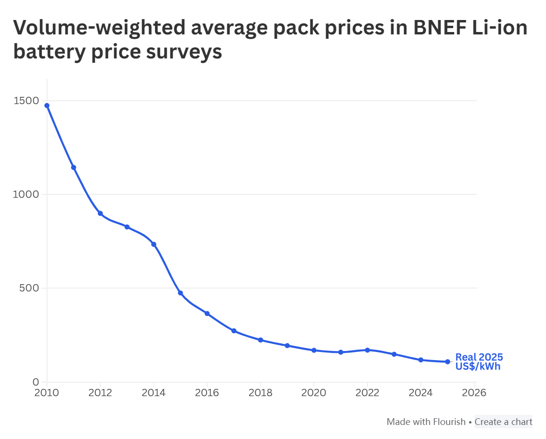 与此同时,电芯价格下降5%,至每千瓦时74美元。总体而言,BNEF称,自2010年以来,电池组价格已下降93%,2010年平均价格约为每千瓦时1474美元(按2025年实际美元价值调整)。
