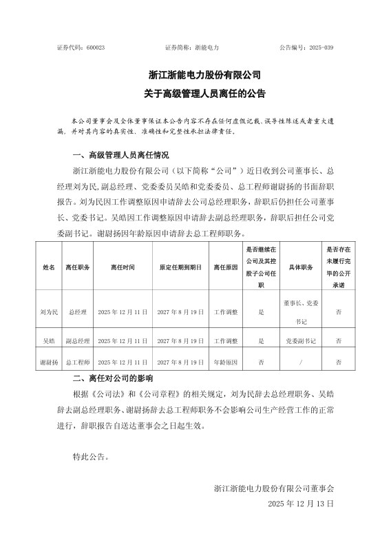 12月13日,浙能电力发布《关于高级管理人员离任的公告》。