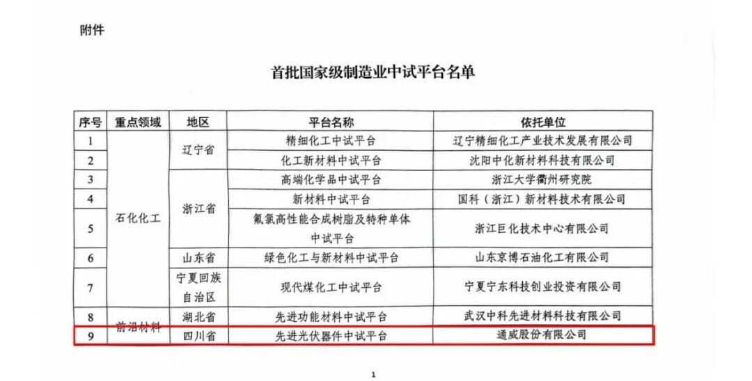 12月11日,工业和信息化部在辽宁省盘锦市召开了制造业中试创新发展座谈会,会议发布了首批国家级制造业中试平台名单。通威股份“先进光伏器件中试平台”成功入选,成为光伏行业唯一获此国家级认定的平台。此次评选在全国范围内进行,共有2400余家平台参选,入选率仅8.5‰。通威平台凭借在技术创新、基础能力建设、服务成效和成果转化方面的综合优势脱颖而出。