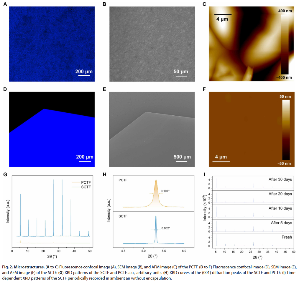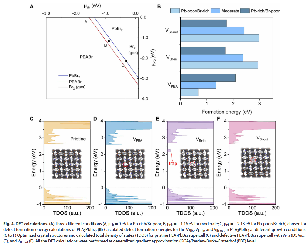 近日,香港理工大学殷俊、清华大学化学系王朝晖和马冬昕等人报道了一种二维钙钛矿PEA2PbBr4单晶薄膜的可控制备策略,获得了大面积、长程有序的高质量单晶薄膜,实现了高亮度的深蓝光发射。这种单晶薄膜晶界数量少,缺陷密度仅有6.9×1014cm−3,表面粗糙度仅为109pm,有效抑制了非辐射复合和电声耦合效应,光致发光量子产率高达48%。