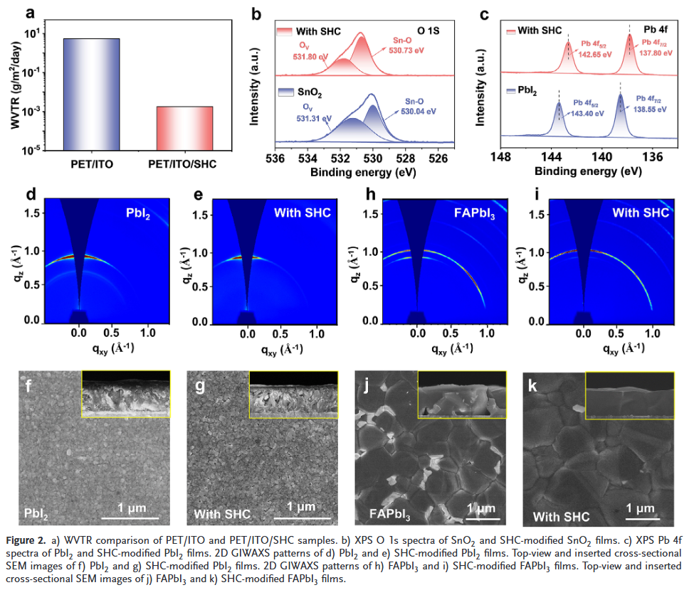 2. 结晶调控与膜质提升:SHC与PbI₂相互作用,引导其垂直取向生长,促进钙钛矿形成致密、高取向、低缺陷的薄膜,显著提升器件光伏性能。