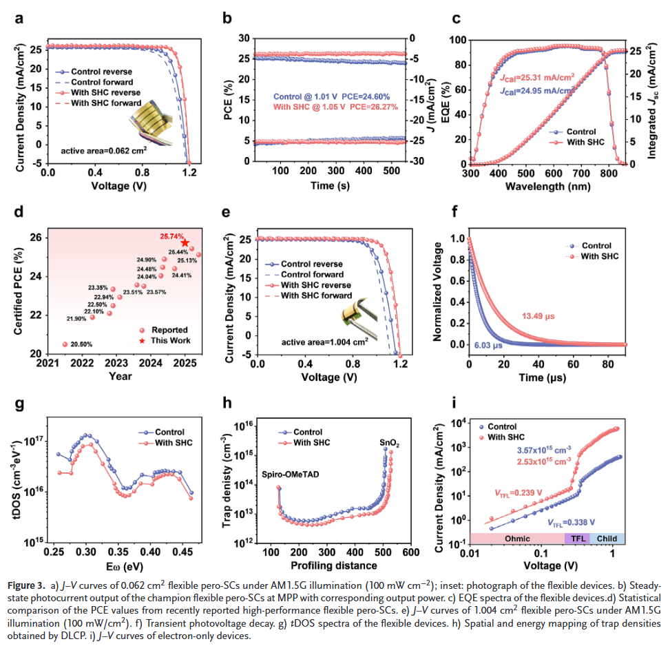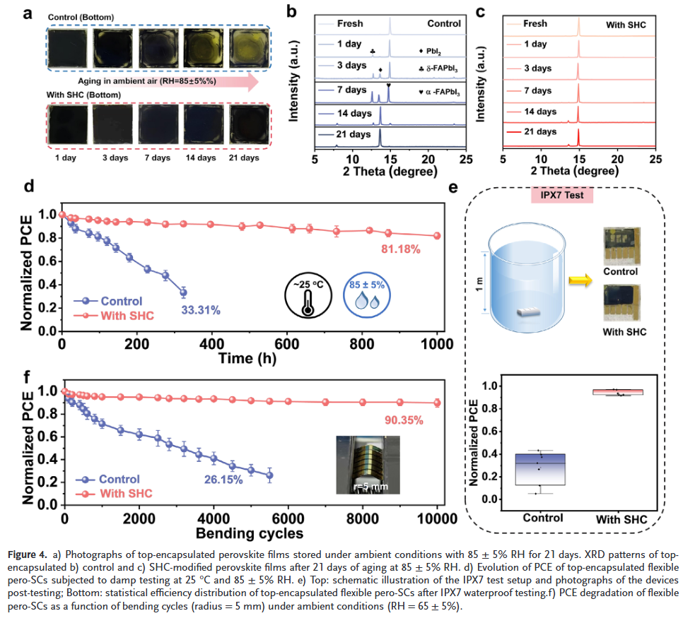 3. 高效率与高稳定性兼具:柔性器件实现26.38%的创纪录效率(认证25.74%),并在85%湿度下保持超过1000小时的T80寿命,同时通过IPX7防水认证,兼具优异的机械弯曲稳定性。
