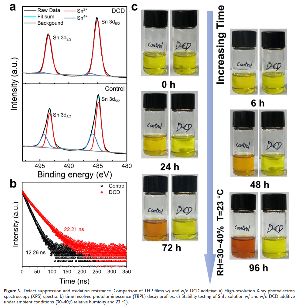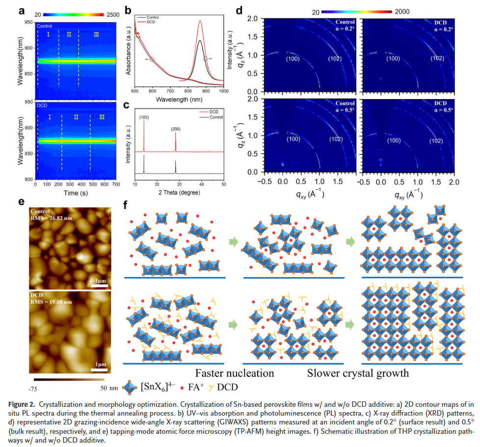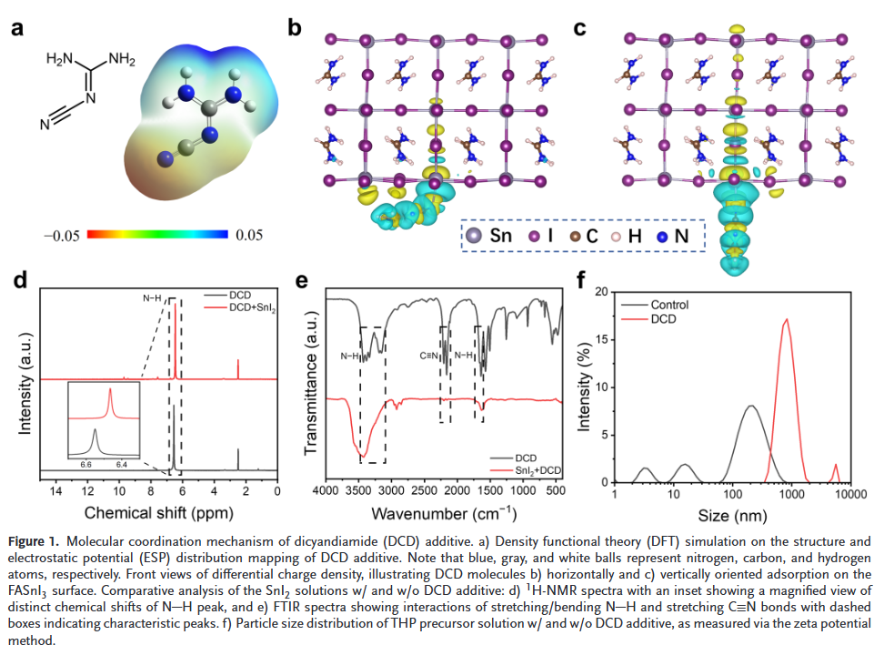- 提出“双重配位”机制:DCD通过Sn←N(路易斯酸碱作用)与N─H⋯I(氢键)双重化学键协同作用,精准调控钙钛矿前驱体胶体行为、抑制Sn²⁺氧化、并钝化界面缺陷。