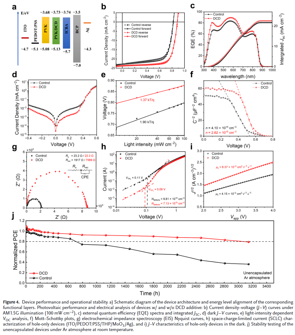 值得注意的是,未封装的DCD改性器件在氩气气氛中储存3100小时后仍保持80%的初始效率。本研究为推进环境友好型钙钛矿光伏器件提供了一种简便的结晶调控与缺陷钝化双重策略。