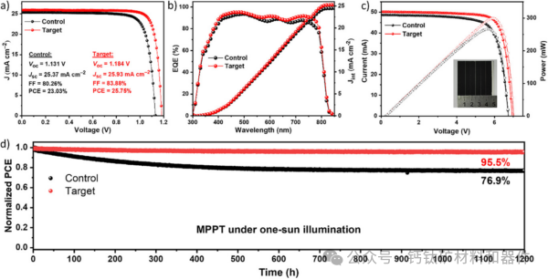 在标准照明条件下测试,该装置实现了25.75%的功率转换效率,1184 mV的开路电压,25.93 mA/cm2的短路密度,以及84%的填充因子。相比之下,没有Mxene夹层的参考单元效率为23.03%,开路电压为1,131 mV,短路密度为25.37 mA/cm2,填充系数为80%。该单元在1200小时后仍保持了95.5%的初始效率,而对照器件仅达到76.9%。