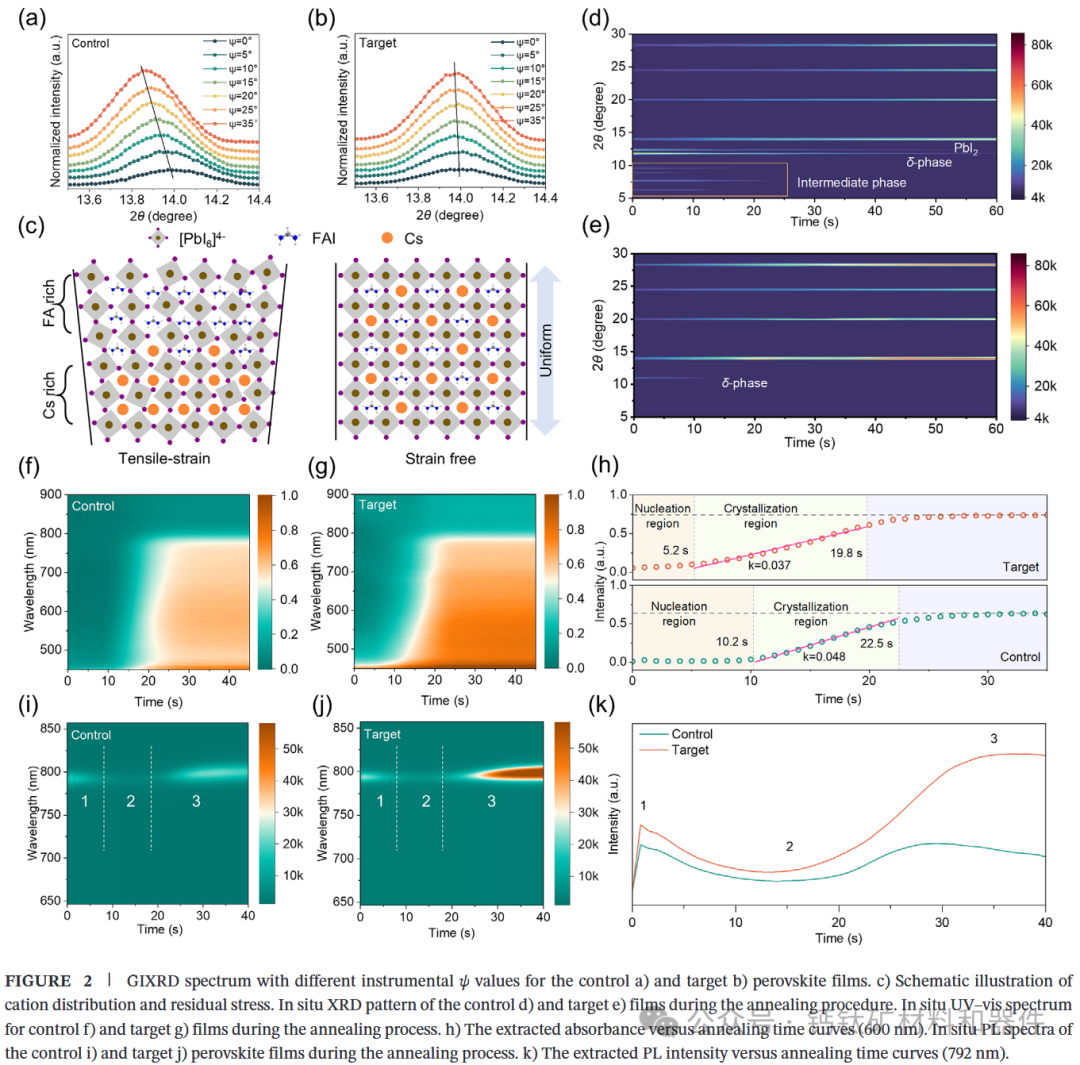 然而,在实际制备过程中,Cs+和FA+在薄膜垂直方向上的分布往往并不均匀:Cs+更容易与[PbI3]-框架形成更强的相互作用,倾向于在靠近电极一侧的“埋底界面”富集,而FA+则更多分布在薄膜表面区域。这样的阳离子梯度会导致局域结构畸变和相分离,诱导非理想晶粒生长和缺陷富集,加速器件性能衰退。与此同时,钙钛矿成膜过程通常伴随快速结晶以及与刚性衬底之间的热膨胀失配,容易在薄膜内部积累拉伸应力,产生残余应变,进一步恶化界面能级对接与器件长期稳定性。因此,如何在一个统一的设计框架下,同时实现阳离子分布均匀化、结晶动力学精细调控与残余应力有效释放,是Cs/FA混阳离子高效稳定钙钛矿太阳能电池走向实际应用必须解决的关键科学问题。