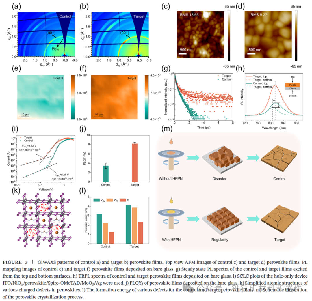 HFPN的引入显著改变了前驱体溶液中的胶体结构,使胶体粒径更大、更集中,有利于可控成核。原位表征表明,体系在HFPN作用下成核时间提前,但晶体生长过程更加平缓,形成“快成核、稳生长”的理想结晶路径。由此可以有效抑制δ相和残余PbI2等不利杂相的生成,显著提升薄膜的相纯度与织构取向。最终获得晶粒尺寸更大、表面更平整致密的高质量CsxFA1-xPbI3薄膜。