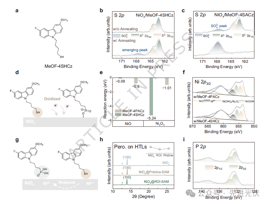 图 1 聚焦 NiOₓ-钙钛矿界面氧化还原反应,验证 ROI-SAM策略核心机制:a 为新型 SAM 分子 MeOF-4SHCz 结构;b、c 通过 XPS 证实其巯基氧化为磺酸基;f 显示 Ni³⁺被还原,价态均一化;h 通过 XRD 表明钙钛矿结晶质量提升;i 验证常规 SAM 与 Ni²⁺的结合未受影响,整体证实双分子靶向结合的有效性