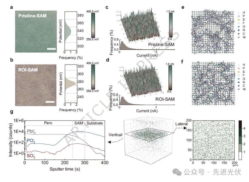 图 2 聚焦SAM 在 NiOₓ表面的分布特性,通过 KPFM、c-AFM、分子模拟和TOF-SIMS 证实:ROI-SAM 体系电势与电流分布更均一(标准差14.5 mV、RMS 0.134 nA),分子分散性提升;SO₃⁻与PO₃⁻深度一致且横向分布均匀,证明 SAM 层覆盖全面、结合稳定,为电荷传输优化奠定基础