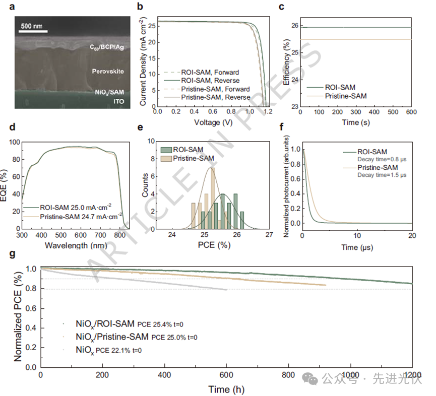 图4 聚焦器件最终性能,通过多项表征证实优势:截面 SEM 展示完整层状结构;J-V 曲线显示 ROI-SAM 体系 PCE 达 26.5%(认证 26.28%),Jsc、Voc、FF 均优于常规 SAM;EQE 和稳态 PCE 验证效率真实性;TPC 测试表明电荷提取更高效(延迟 0.8μs);MPP 跟踪显示 T₉₀>1000 小时,证实效率与稳定性双突破。