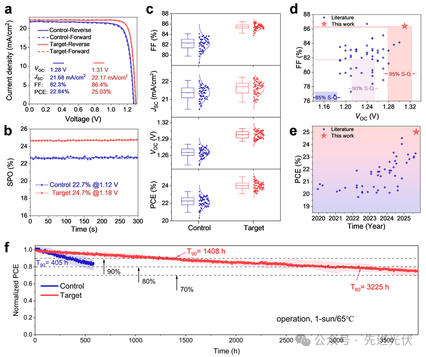 针对这一核心瓶颈,中中科院半导体所游经碧&蒋琦团队提出三聚氰胺碘化物(MLAI)添加剂调控策略,通过热力学与动力学双重调控,实现RbCsFA 体系宽带隙钙钛矿的均匀相分布,并显著提升了载流子迁移率。经优化后的1.68 eV宽带隙钙钛矿太阳能电池展现出优异的电荷传输性能与极低的非辐射复合损失,最终实现开路电压为1.31 V、填充因子为86.4%、PCE为25%的器件性能。基于该钙钛矿顶电池,团队进一步制备出两端钙钛矿-硅叠层器件,其稳态效率达33.5%,开路电压高达2.02 V。在稳定性方面,宽禁带单结电池在65℃、1太阳光照(ISOS-L-2)条件下运行3200小时后仍保持80%初始效率(T80),而叠层器件在相同条件下的T90寿命超过1100小时,展现出卓越的运行稳定性。
