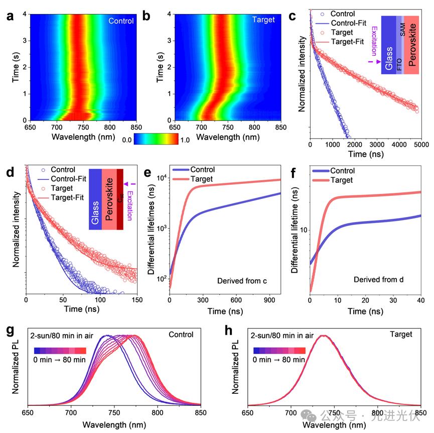 图2通过多种光电表征证明了MLAI添加剂对钙钛矿薄膜性能的全面提升。原位PL监测(图2a,b)显示MLAI延缓了结晶初期过程的荧光峰位移动,表明其有效调控了结晶动力学。TRPL测试(图2c,d)表明,MLAI修饰的薄膜载流子寿命从0.8 μs显著延长至2.47 μs,证实缺陷态密度大幅降低。微分寿命分析(图2e,f)进一步显示,MLAI样品在界面处具有更快的电荷提取速率和更低的陷阱辅助复合。光稳定性测试(图2g,h)表明,在2倍太阳光下照射80分钟后,对照组出现约35 nm的荧光红移(相分离),而MLAI组几乎无偏移,证明其优异的光稳定性。畸变,为器件稳定性提升提供机制解释。