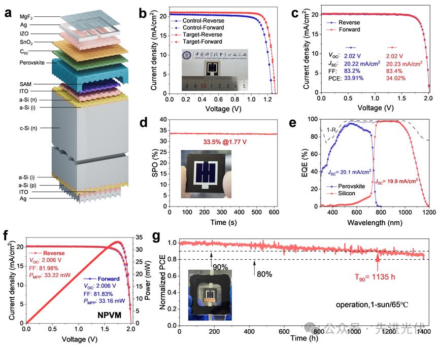 图4展示了基于MLAI优化宽禁带顶电池的叠层器件性能。1 cm² 半透明单结器件(图4b)效率达22.77%,证明MLAI技术具备放大潜力。叠层器件J-V曲线(图4c)实现33.91%的反扫效率,Voc高达2.02 V,FF达83.15%。稳态输出(图4d)确认效率稳定在33.5%。EQE谱(图4e)显示顶底电池电流匹配良好(20.1/19.9 mA/cm²)。认证结果(图4f)独立验证效率为33.22%,Voc达2.01 V。稳定性测试(图4g)显示封装叠层器件在65°C光照下T90超过1100小时,展现了从实验室向产业化应用的重要进展。