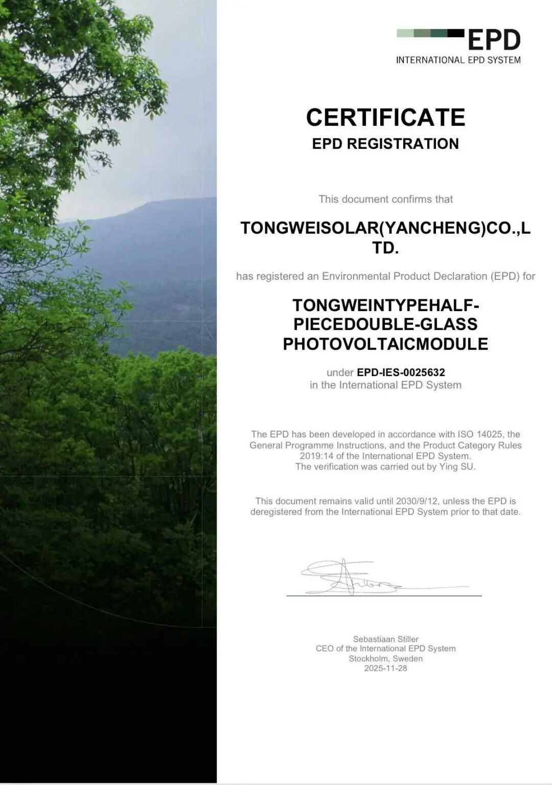 近日,通威太阳能科技盐城基地在绿色发展领域取得重大突破,成功获得由国际环境产品声明(EPD)系统签发的EPD认证证书,这不仅是盐城基地在推进绿色制造、深化产品全生命周期环境管理的关键成果,也彰显了通威践行环境透明与可持续发展的坚定承诺。