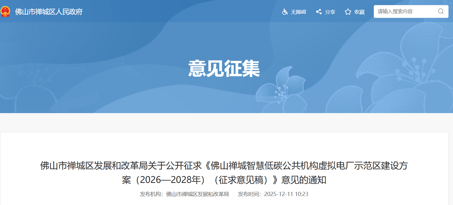 广东省佛山市禅城区发展和改革局发布关于公开征求《佛山禅城智慧低碳公共机构虚拟电厂示范区建设方案(2026—2028年)(征求意见稿)》意见的通知,其中提到,工作目标是按照“政府引导、市场运作、技术驱动、产业带动”的原则,建立完善“资源挖掘—能效提升—智能调控—平台聚合—市场变现”的虚拟电厂全链条运作体系,打造佛山禅城智慧低碳公共机构虚拟电厂示范区。