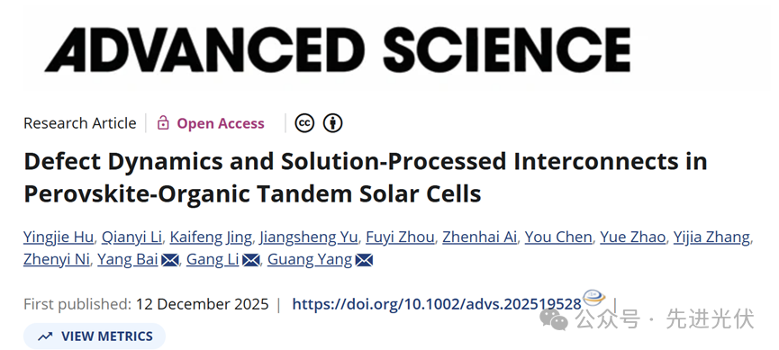 Hu Y, Li Q, Jing K, et al. Defect Dynamics and Solution-Processed Interconnects in Perovskite-Organic Tandem Solar Cells. Advanced Science (2025).