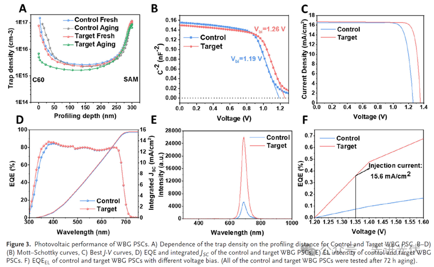 3.研究通过一系列光伏性能表征,进一步证实了老化后的目标宽带隙钙钛矿太阳能电池具有更低的陷阱密度和更优异的性能。莫特-肖特基曲线分析显示,目标器件具有更高的内建电势(1.26 V vs 对照组的1.19 V),表明其缺陷态密度降低且载流子传输效率得到改善。器件性能方面,冠军目标器件实现了19.38%的最佳光电转换效率,其稳态效率也达到19.32%,显著高于对照组冠军器件的16.64%。效率提升主要源于开路电压的大幅增加:目标器件获得了1.35 V的高开路电压,对应的电压损失仅为460 mV,处于极低水平。外量子效率谱确定的带隙为1.81 eV,且积分电流密度与J-V曲线测得值吻合。为量化非辐射复合损失,研究进行了电致发光测量。在相同注入电流下,目标器件的电致发光强度是对照组的五倍以上。更重要的是,目标器件在等效于短路电流密度条件下的电致发光外量子效率达到0.36%,相较于对照组的0.02%提升了近两个数量级。这一巨大差异强有力地证实了目标器件中非辐射复合损失被显著抑制,从而直接支撑了其开路电压的提升。所有这些性能改善,根本原因在于表面钝化策略有效捕获并中和了移动缺陷。