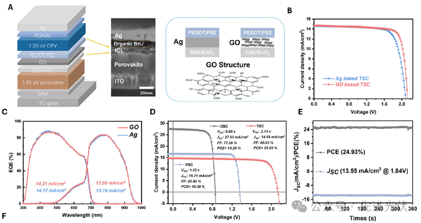 3.溶液加工GO连接层:开发溶液法加工的氧化石墨烯作为中间连接层,替代传统蒸镀金属,在实现高透光率和优异电荷复合的同时,大幅提升了叠层器件的稳定性。