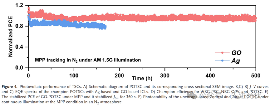 推动商业化进程:所开发的溶液加工工艺和高稳定性GO连接层,有效降低了制备成本并延长了器件寿命,向开发商业可行的叠层光伏技术迈出了关键一步。