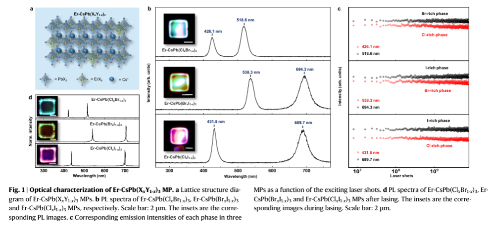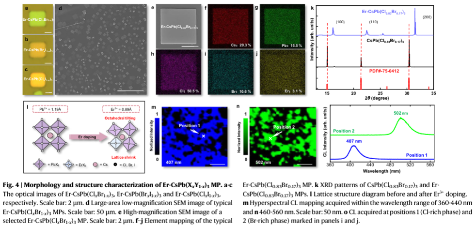 本文国防科技大学朱志宏、郑玮豪和湖南大学庄秀娟等人介绍了一种通过化学气相沉积法将镧系离子掺杂到双卤素合金钙钛矿CsPb(XₓY₁₋ₓ)₃(X、Y=Cl、Br、I)中的策略,获得了一系列高质量、稳定的微米片。
