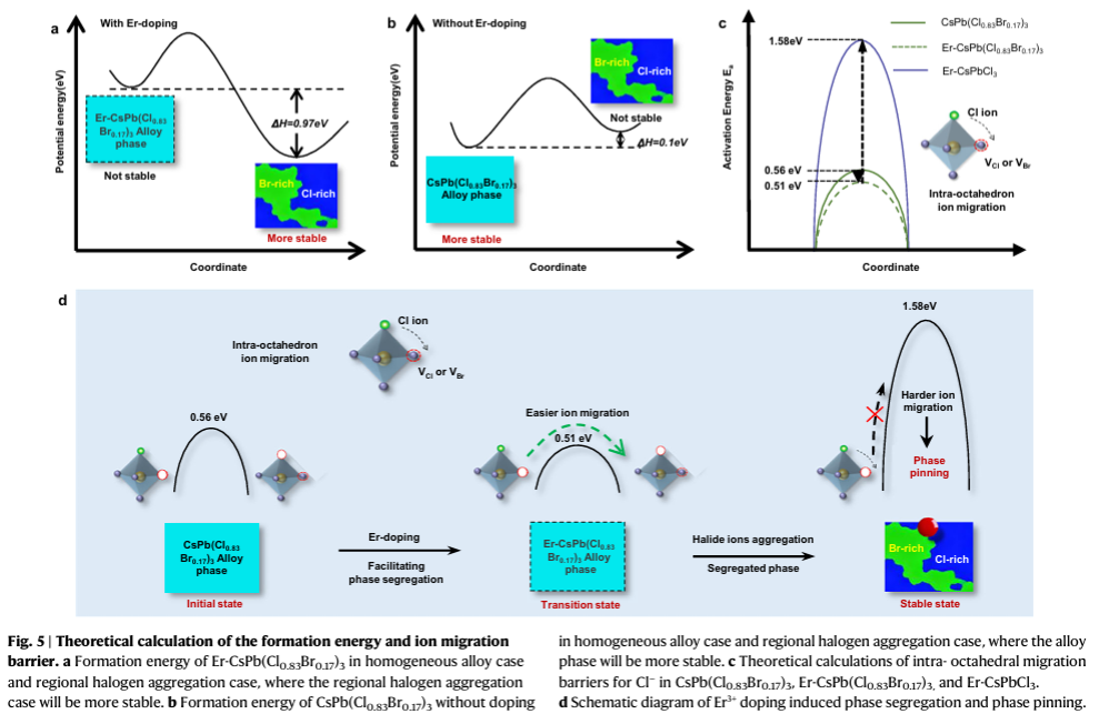 - 通过理论计算揭示“相钉扎”机制:镧系掺杂在合金态降低离子迁移势垒促进分相,在分离相中大幅提高势垒实现离子钉扎,为钙钛矿稳定性设计提供了新思路。