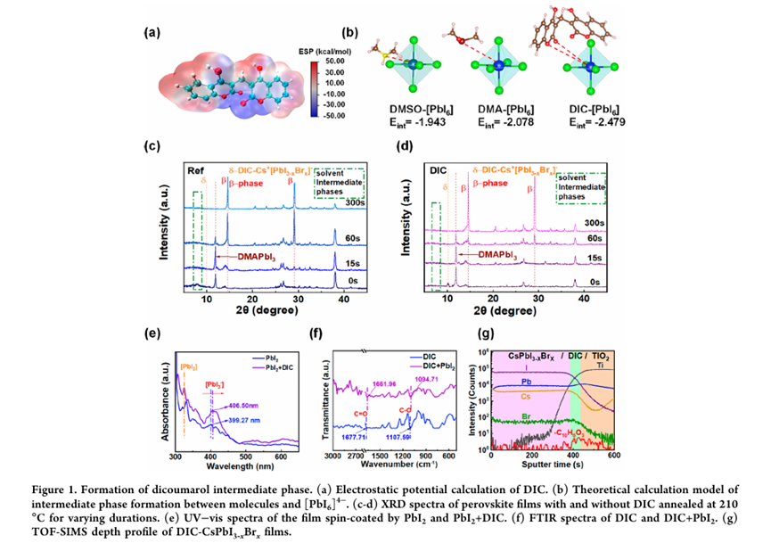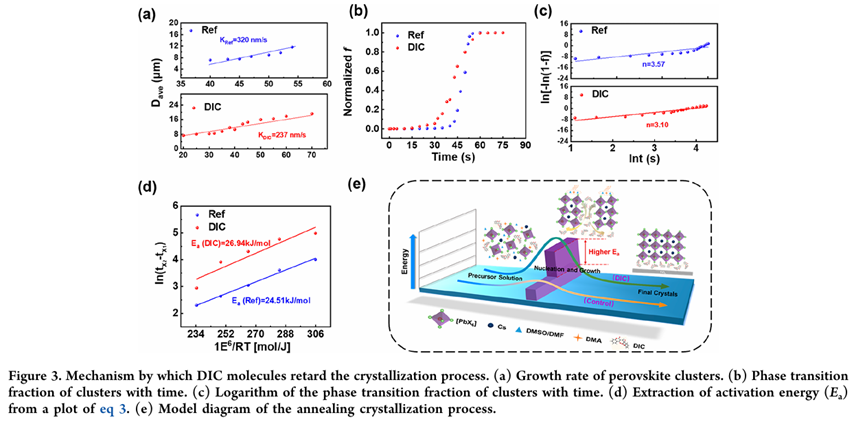 1.创新结晶调控机制:DIC 与钙钛矿前驱体形成 δ 相异质晶种,强相互作用(结合能 - 2.479 eV)抑制溶剂中间相生成,推动溶剂挥发,使有效扩散活化能提升至 26.9 kJ/mol,实现 “快速成核 - 缓慢结晶”。