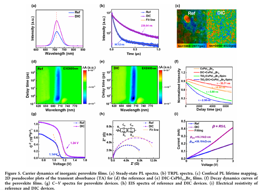 2.高效缺陷钝化策略:DIC 通过C-O/C=O 协同作用钝化未配位 Pb2+ 能 - 1.699 eV)、-OH 与碘形成氢键,使陷阱密度从 9.59×1015 cm-3降至4.79×1015 cm-3,载流子寿命延长至 236.64 ns。