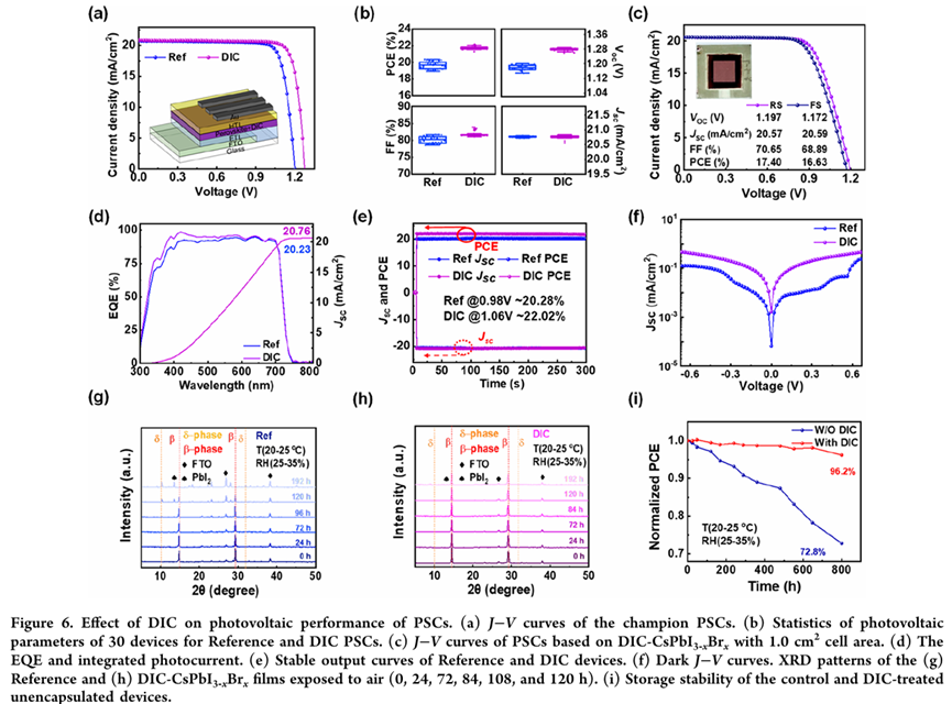 3.效率稳定性双突破:小面积器件 PCE 达 22.14%,1.0 cm² 大面积器件达 17.40%;未封装器件在环境条件下 800 小时保留 96.2% 初始效率,显著抑制 δ 相转变。