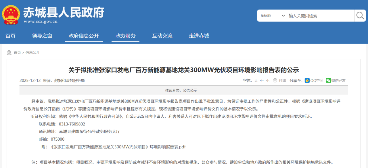 12月12日,河北省张家口市赤城县人民政府发布《关于拟批准张家口发电厂百万新能源基地龙关300MW光伏项目环境影响报告表的公示》。