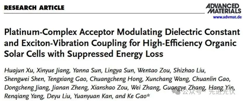 Huajun Xu, Xinyue Jiang, Ke Gao*, et al. Platinum-Complex Acceptor Modulating Dielectric Constant and Exciton-Vibration Coupling for High-Efficiency Organic Solar Cells with Suppressed Energy Loss. Adv. Mater. 2025, e20639.