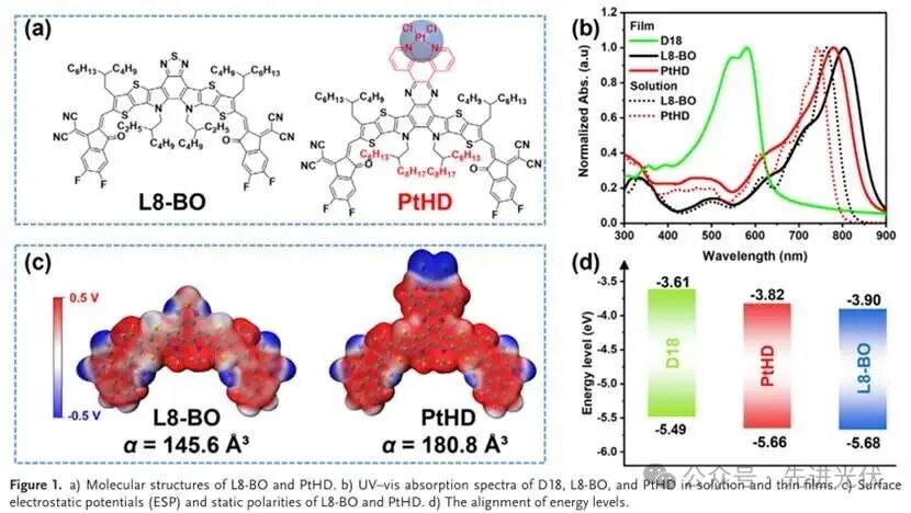 图1给出了PtHD与L8-BO的化学结构式,凸显了PTHD以菲咯啉为配体与Pt(II)中心配位的核心特征。紫外-可见吸收光谱显示,无论在溶液还是薄膜中,PTHD的吸收相对L8-BO均发生蓝移,这归因于Pt配位单元的强拉电子效应减弱了分子内电荷转移。表面静电势图与计算结果表明,PTHD的分子中心呈现更强的正电势,且其静态偶极矩高达17.82 D,远高于L8-BO,这有利于界面激子分离。能级排列图显示PTHD具有与L8-BO匹配的HOMO/LUMO能级,为其作为第三组分融入三元体系奠定了基础。该图从分子层面揭示了PTHD实现高效激子解离与低能量损失的内在优势。