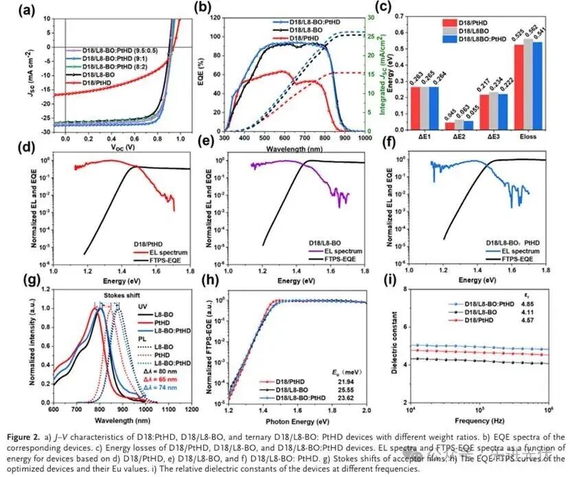 图中J-V曲线显示,D18/PH1D二元器件获得最高的开路电压Voc(0.938 V),但受限于形貌,效率仅为7.13%。而引入10 wt% PH1D的三元器件(D18/L8-BO:PH1D)在保持高Voc(0.918 V)的同时,Jsc和FF显著提升,最终获得20.52%的冠军效率。对应EQE谱表明,三元器件在300-700 nm宽谱范围内响应均得到增强,印证了Jsc的提升。能量损失分解图定量揭示,PH1D的引入有效降低了与无序度相关的ΔE₂(从0.063 eV降至0.055 eV)及非辐射复合损失ΔE₃(从0.234 eV降至0.222 eV)。通过FTPS-EQE与电致发光谱进一步量化了各损失分量,证明PH1D通过提升介电常数和抑制激子-振动耦合,是实现低能量损失的关键。