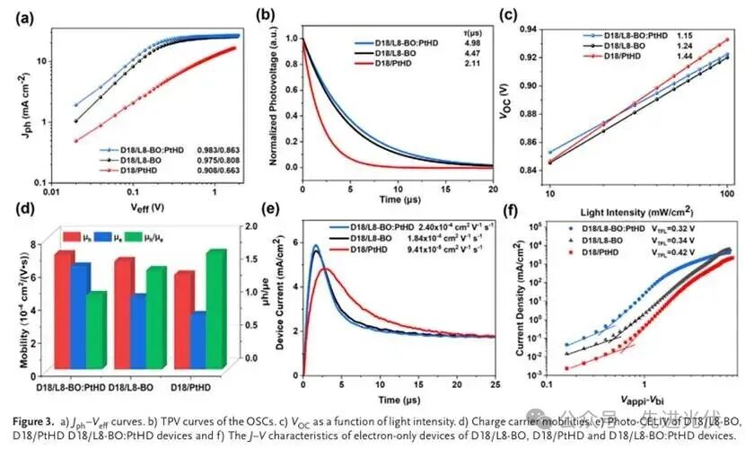 通过Jph-Veff曲线分析,D18/L8-BO:PTHD器件获得了最高的激子解离概率(98.3%)和电荷收集概率(0.863),表明PTHD的引入显著提升了激子利用与电荷提取效率。瞬态光电压(TPV)测试显示,三元器件载流子寿命延长至4.98 μs,证明非辐射复合被有效抑制。VOC随光强变化曲线的斜率降低,对应理想因子n=1.15,印证了陷阱辅助复合的减弱。Photo-CELIV结果表明三元器件具有更高的有效载流子迁移率(2.40×10⁻⁴ cm² V⁻¹ s⁻¹)。空间电荷限制电流(SCLC)测试进一步证实,三元器件陷阱态密度最低(1.61×10¹⁶ cm⁻³),且载流子迁移率更为平衡。这些数据共同表明,PTHD通过优化电荷生成、传输与收集全过程,为实现高效率器件提供了关键动力学基础。