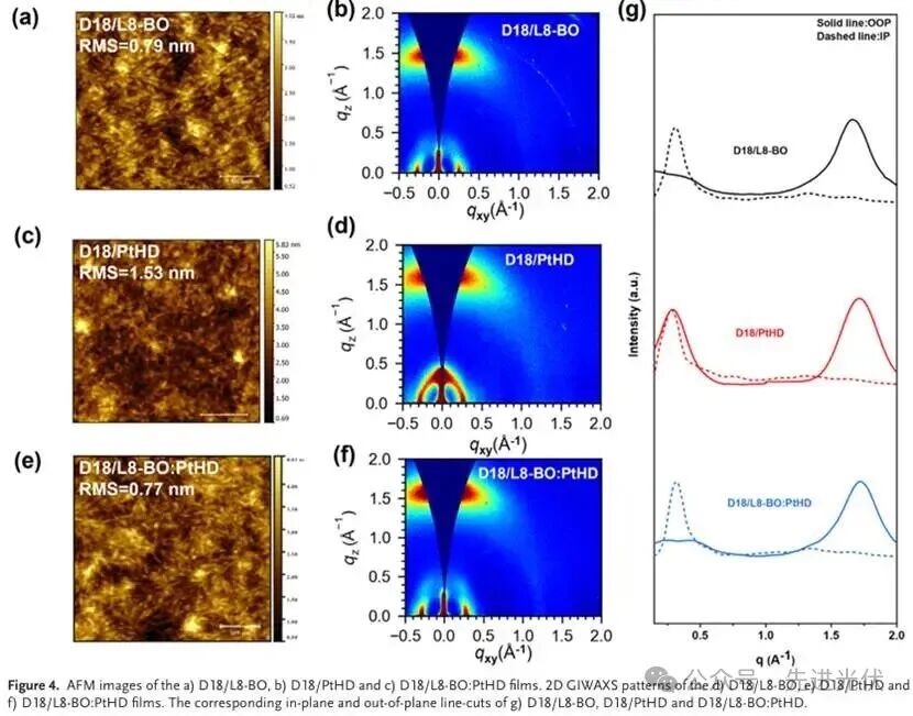 AFM形貌图显示,D18/L8-BO:PtHD三元薄膜表面粗糙度(RMS=0.77 nm)与二元D18/L8-BO薄膜相当,且保持了均匀的纤维状互穿网络,而D18/PtHD二元膜则因PtHD过度结晶而呈现粗糙表面与粗大相分离域。2D GIWAXS图谱及其线扫分析证实,三元薄膜具有更短的π-π堆叠距离(3.63 Å)和更大的晶体相干长度(27.18 Å),表明分子堆积更为紧密有序,有利于电荷传输。XPS分析进一步揭示了PtHD与L8-BO之间存在强相互作用(Pt 4f和Cl 2p结合能发生协同位移),这促进了分子间的紧密堆积,从而实现了对活性层纳米结构的精准调控。