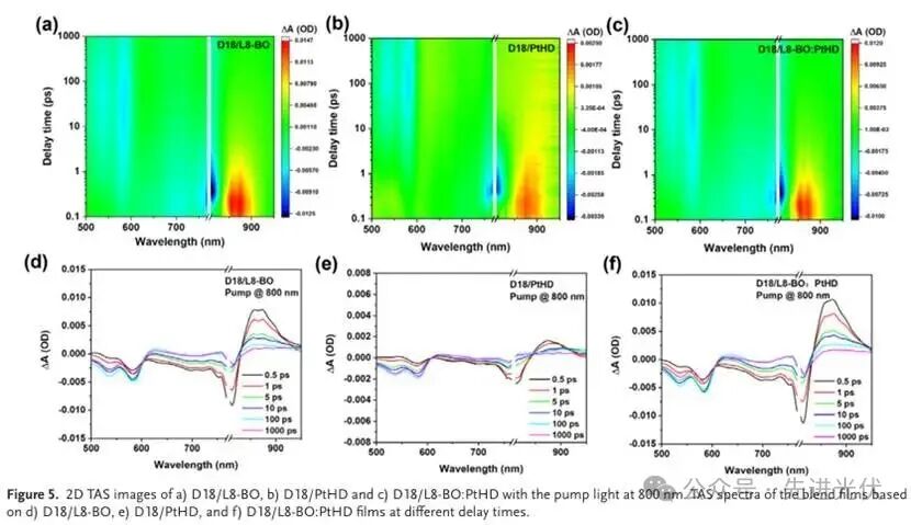 2D TA图谱与时间分辨光谱显示,在800 nm激发下,D18/L8-BO:PtHD三元薄膜中给体D18在600 nm处的基态漂白信号出现更快,表明空穴从受体向给体的转移过程被加速。动力学拟合进一步证实,三元体系中的激子分离时间(τ₁=0.45 ps)与扩散至界面时间(τ₂=6.89 ps)均短于两个二元体系,说明PtHD的引入有效促进了激子在给受体界面的解离。此外,受体单线态激子信号衰减更快,结合激子扩散长度计算(从17.77 nm提升至20.69 nm),共同表明PtHD能延长激子扩散距离并加速电荷分离,从而降低复合概率,为器件获得高Jsc和FF提供了关键的动力学基础。