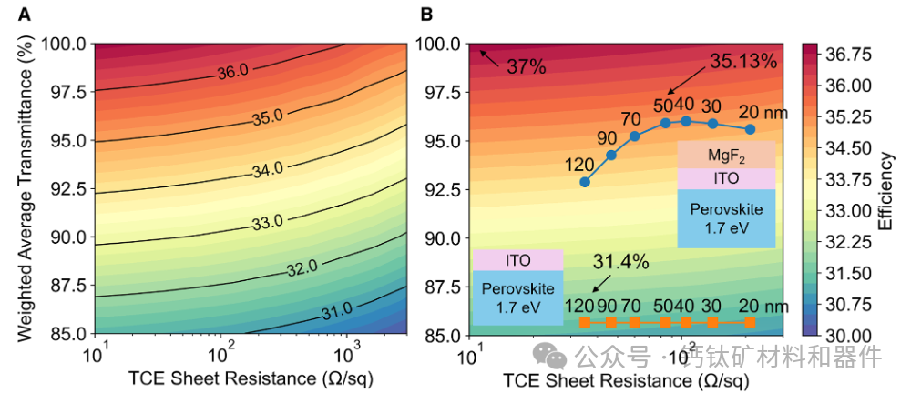 串联效率随 TCE WAT 和 R_sh 变化的情况 (A) 任意组合的 TCE 透光率和片电阻的实际限制。(B)评估了带有和不带有厚度优化抗反射涂层的 ITO 薄膜。颜色图比例适用于 (A) 和 (B) 两者。