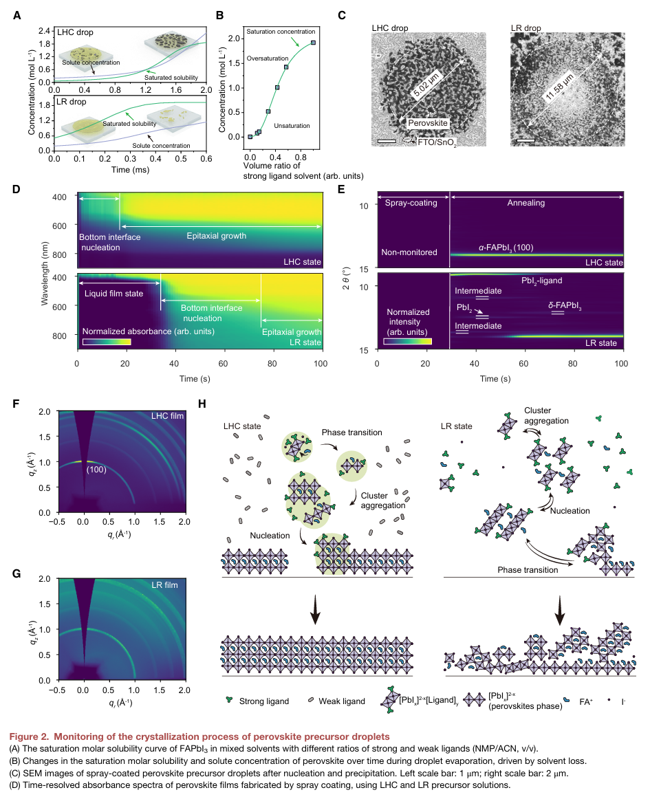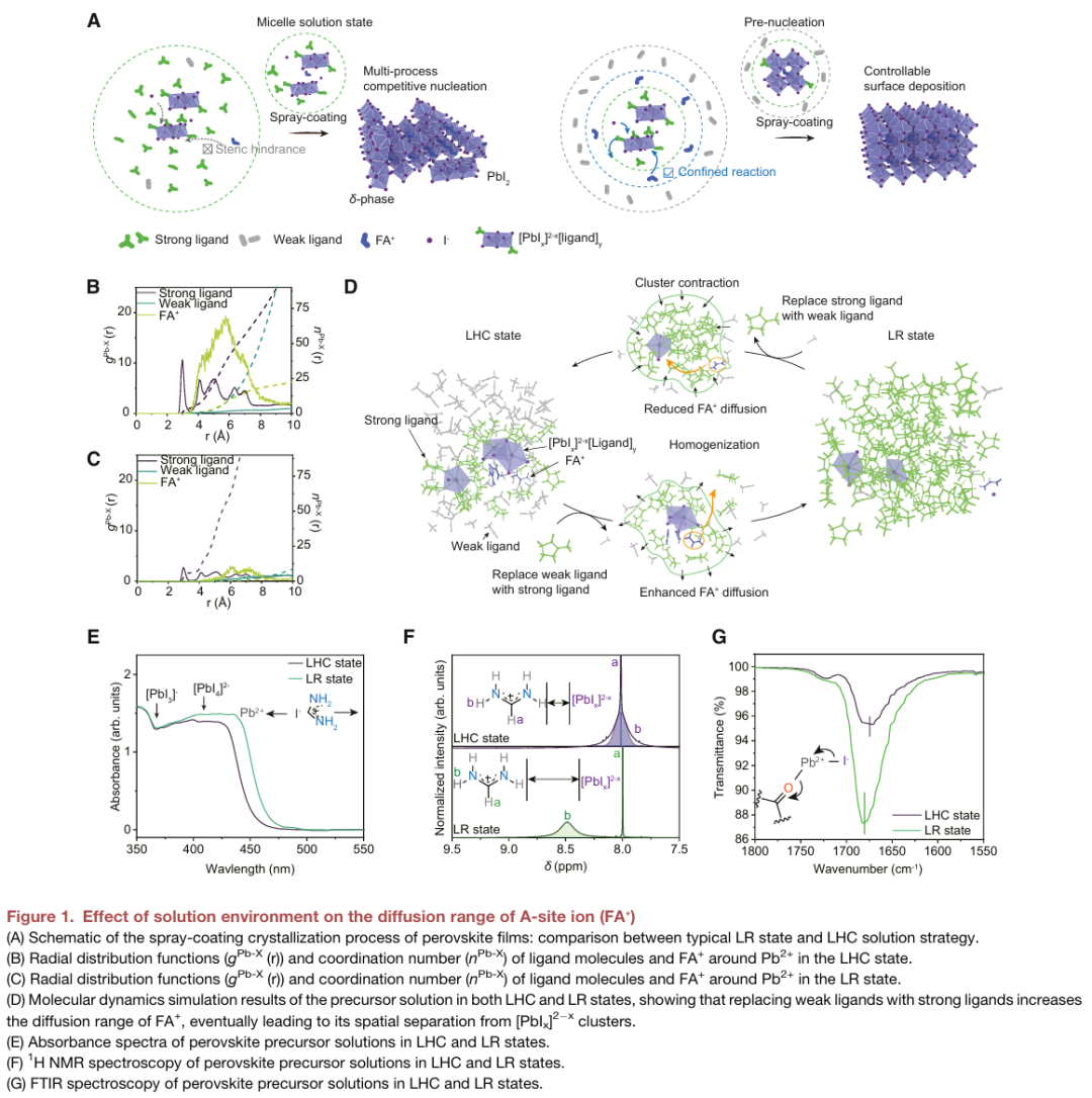 本研究阿卜杜拉国王科技大学Stefaan De Wolf、山东师范大学唐波、中国科学院青岛生物能源与过程研究所邵志鹏和崔光磊等人提出了一种溶剂化调控策略,通过喷涂沉积将钙钛矿结晶限制在局部溶剂簇内。这种受限生长显著降低了晶体形成的能量势垒,即使在高湿度条件下也能实现均匀、低缺陷的薄膜。该方法支持在任意曲面上可控制备厚度可调的高效钙钛矿光电器件,并具备规模化生产潜力。