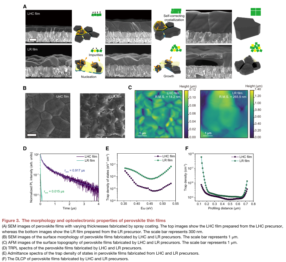 1. 提出“局部高浓度”前驱体策略,实现喷涂过程中的受限结晶,有效抑制咖啡环效应,获得高取向、低缺陷(~10¹⁴ cm⁻³)的钙钛矿薄膜。