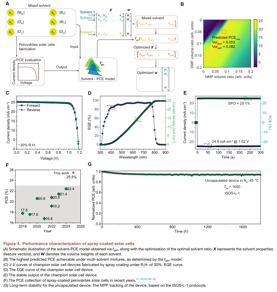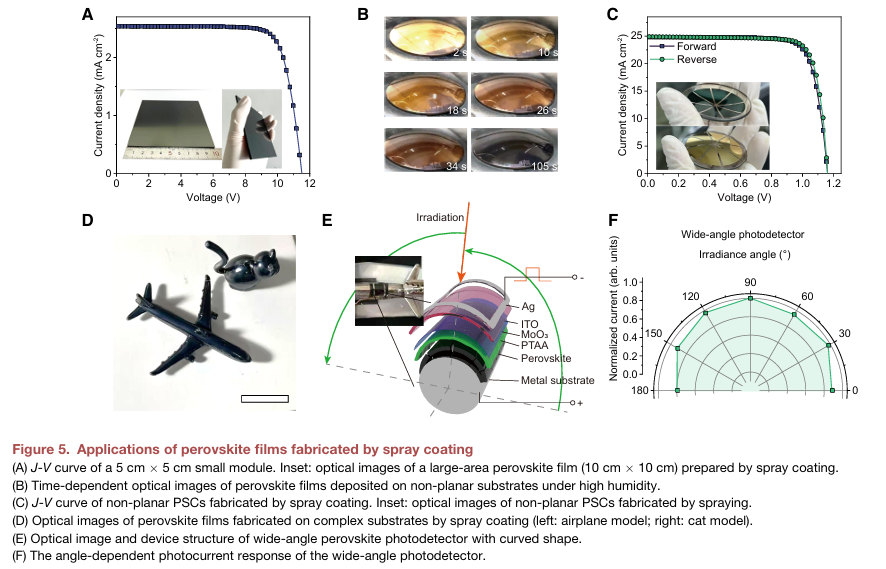 2. 喷涂钙钛矿太阳能电池效率突破25.5%,并首次在80%高湿度环境下稳定制备,效率仍达23.1%,展现出优异的工艺适应性与环境鲁棒性。